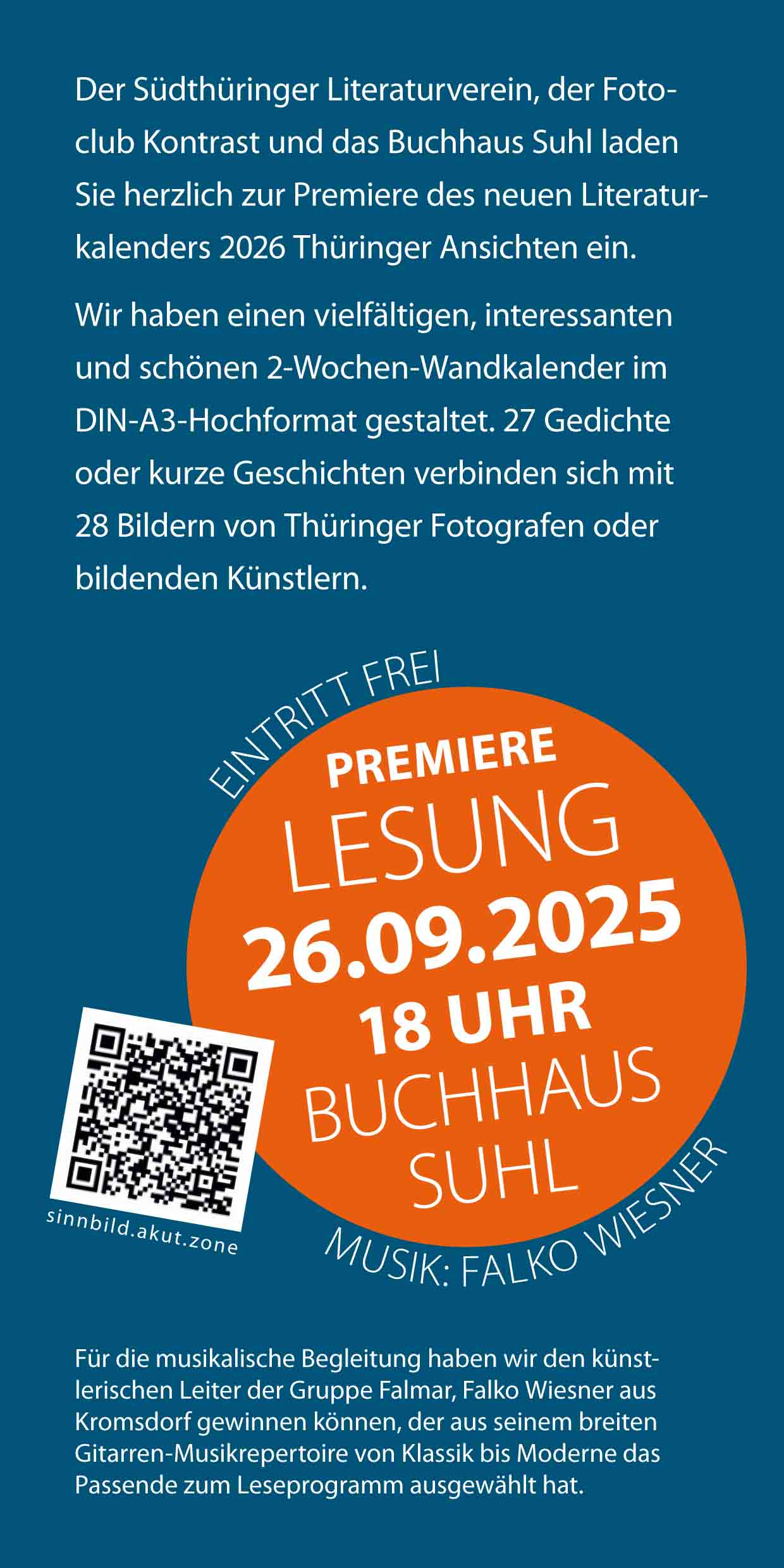 Auf der literarischen Bühne wird u. a. Thomas Schwämmlein, Historiker, langjähriger Redakteur beim Freien Wort in Sonneberg und im Nebenamt Kreisheimatpfleger aktiv werden. Neben ihm agiert u. a. Holger Uske, Dipl.-Ingenieur, nach 1990 Redakteur und dann viele Jahre Pressesprecher der Stadt Suhl. Seit 1990 leitet er den Südthüringer Literaturverein, unter dessen Dach seit 1998 sechs Literaturkalender "Thüringer Ansichten" erschienen mit Texten, Fotografien und Bilder hiesiger Künstler. Diese Texte sollen zum einen im Mittelpunkt des Lese-Musik-Gesprächsabends stehen. Zum anderen ergab sich Spannendes und Witziger schon beim Entstehen wie auch beim Vorstellen der thüringenweit einzigartigen Kalender. Davon wird an diesem Abend auch von weiteren Beteiligten zu hören sein. Übrigens erschien der jüngste Kalender für dieses Jahr. Restexemplare sind an diesem Abend frei erhältlich. Ein Angebot, das dann immerhin noch zwei Wochen aktuell ist – oder auch länger, denn wer schaut schon aufs Kalendarium...