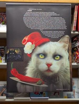 Blick ins Premierenpublikum - Falko Wiesner in Aktion. alle Fotos: A. Uske Nebenstehend: Holger Uske und Ulrike Blechschmidt bei der Moderation. - Eines der Kalenderblätter, die großformatig im Buchhaus zu sehen waren, hier die Kurzgeschichte "Hunger" von Ulrike Blechschmidt mit dem Fotokunstwerk "Scha-r-fspelz" von Frank Melech. |