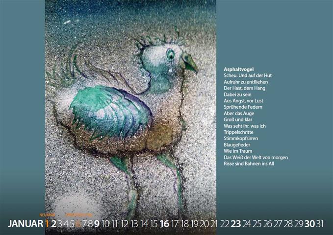 Scheu. Und auf der Hut Aufruhr zu entfliehen Der Hast, dem Hang Dabei zu sein Aus Angst, vor Lust Sprühende Federn Aber das Auge Groß und klar Was seht ihr, was ich Trippelschritte Stimmkopfsirren Blaugefieder Wie im Traum Das Weiß der Welt von morgen Risse sind Bahnen ins All |