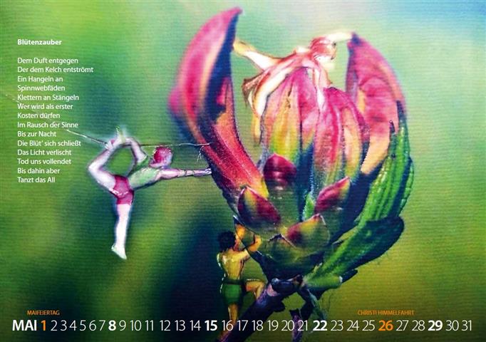 Dem Duft entgegen Der dem Kelch entströmt Ein Hangeln an Spinnwebfäden Klettern an Stängeln Wer wird als erster Kosten dürfen Im Rausch der Sinne Bis zur Nacht Die Blüt' sich schließt Das Licht verlischt Tod uns vollendet Bis dahin aber Tanzt das All