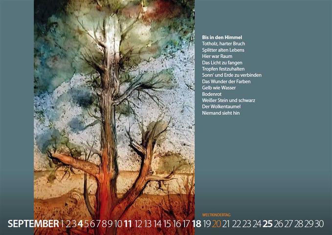 BIS IN DEN HIMMEL Totholz, harter Bruch Splitter alten Lebens Hier war Raum Das Licht zu fangen Tropfen festzuhalten Sonn' und Erde zu verbinden Das Wunder der Farben Gelb wie Wasser Bodenrot Weißer Stein und schwarz Der Wolkentaumel Niemand sieht hin |