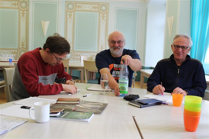 Erneut kamen Anfang April 2017 insgesamt 23 Schreibende der Region nach Hümpfershausen in die Rhön, um an der 28. Südthüringer Literaturwerkstatt teilzunehmen. Das Jugendausbildungszentrum (JABZ) der Thüringer Feuerwehr im Schloss Sinnershausen bot dafür wieder beste Bedingungen. In drei Gruppen wurde an mitgebrachten Texten gearbeitet. Vor Ort entstanden neue literarische Texte. Die Bilder links und rechts zeigen die Jugendgruppe bei ihrem Auftritt im Literaturmuseum Baumbachhaus Meiningen am Samstagabend, dem 8. April. Der Workshop wurde gefördert von der Staatskanzlei des Freistaat Thüringen, der Rhön-Rennsteig-Sparkasse und der Stadt Suhl.. |