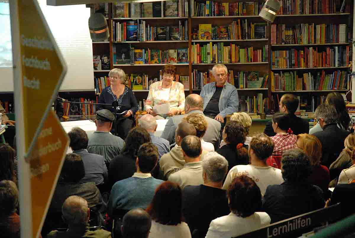Unsere Bilder zeigen Mitglieder des Vereins zur Premiere des Literaturkalenders 2008 am 12.9.2007 im Buchhaus Suhl (oben, v.l. Ursula Schütt, Brigitte Rost und Harald Lindig) sowie zu einer der Literaturwerkstätten Mitte der 90er Jahre in Untermaßfeld bei Meiningen. |